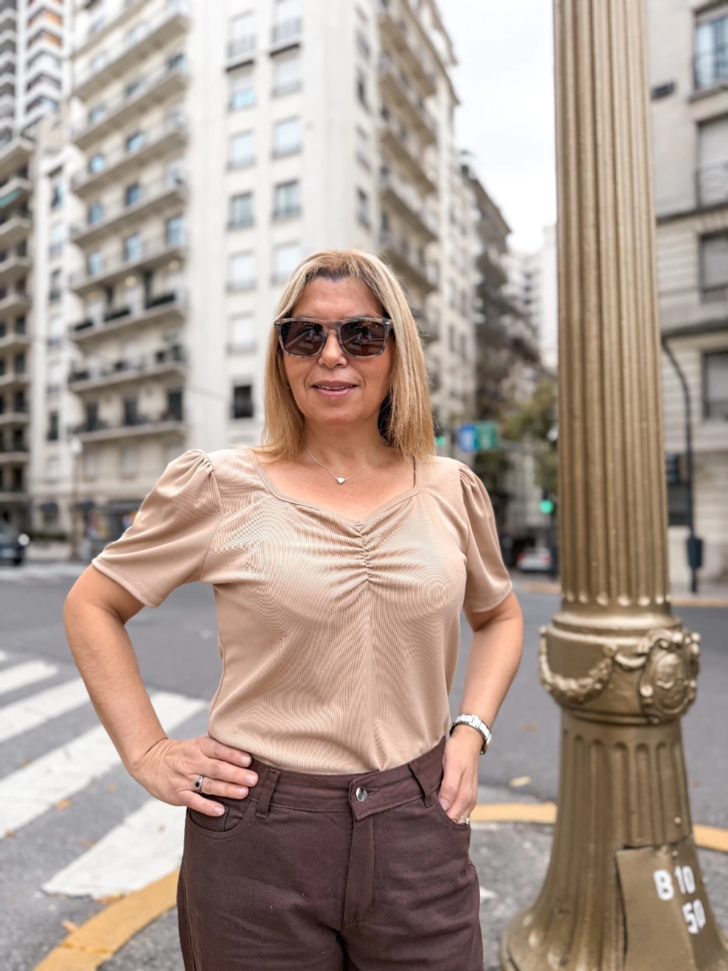 Tiene escote en V, mangas princesa con volumen justo y un elástico interno en la zona del busto que aporta sujeción y comodidad, sin necesidad de corpiño. El calce es al cuerpo, sin marcar de más, y abajo cuenta con broches tipo ganchito para que sea fácil de poner y sacar.